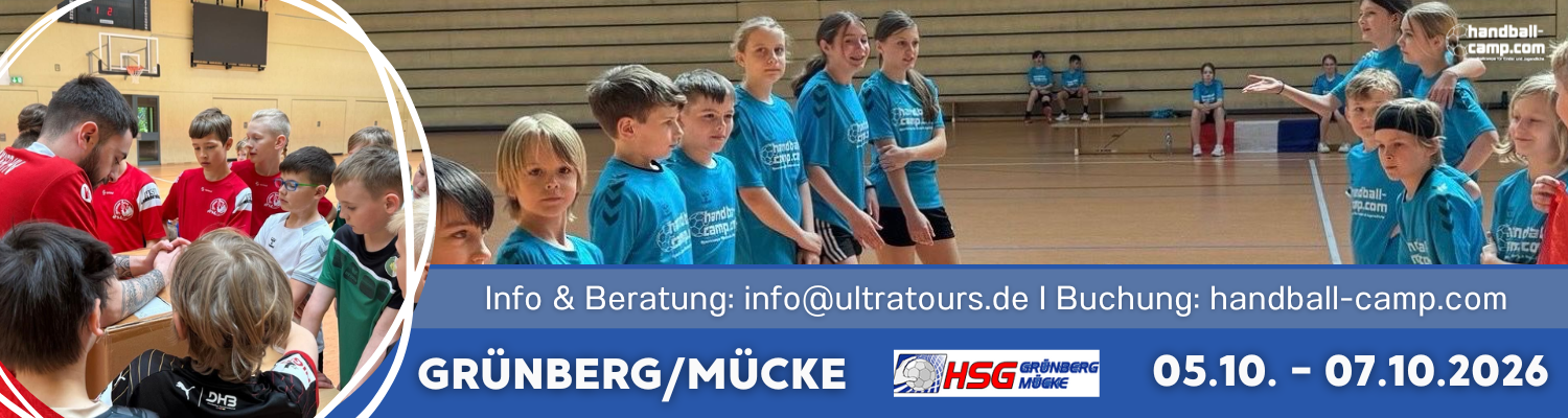 In enger Zusammenarbeit mit der „HSG Grünberg / Mücke“ veranstalten wir in den hessischen Herbstferien 2026 erneut ein Handballcamp. So haben Kinder und Jugendliche im Alter von 8 – 15 Jahren (E-Jugend bis C-Jugend) von Donnerstag bis Samstag die Möglichkeit ihr handballerisches Können mit viel Spaß unter Anleitung unseres kompetenten Trainerteams zu verbessern.
