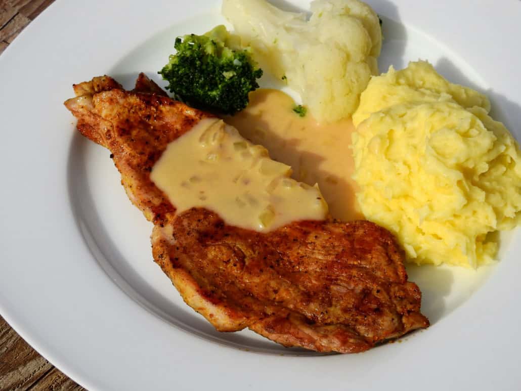 Hier erwartet Dich ein warmes Abendmenü inklusive Salat, Dessert und Getränken.
